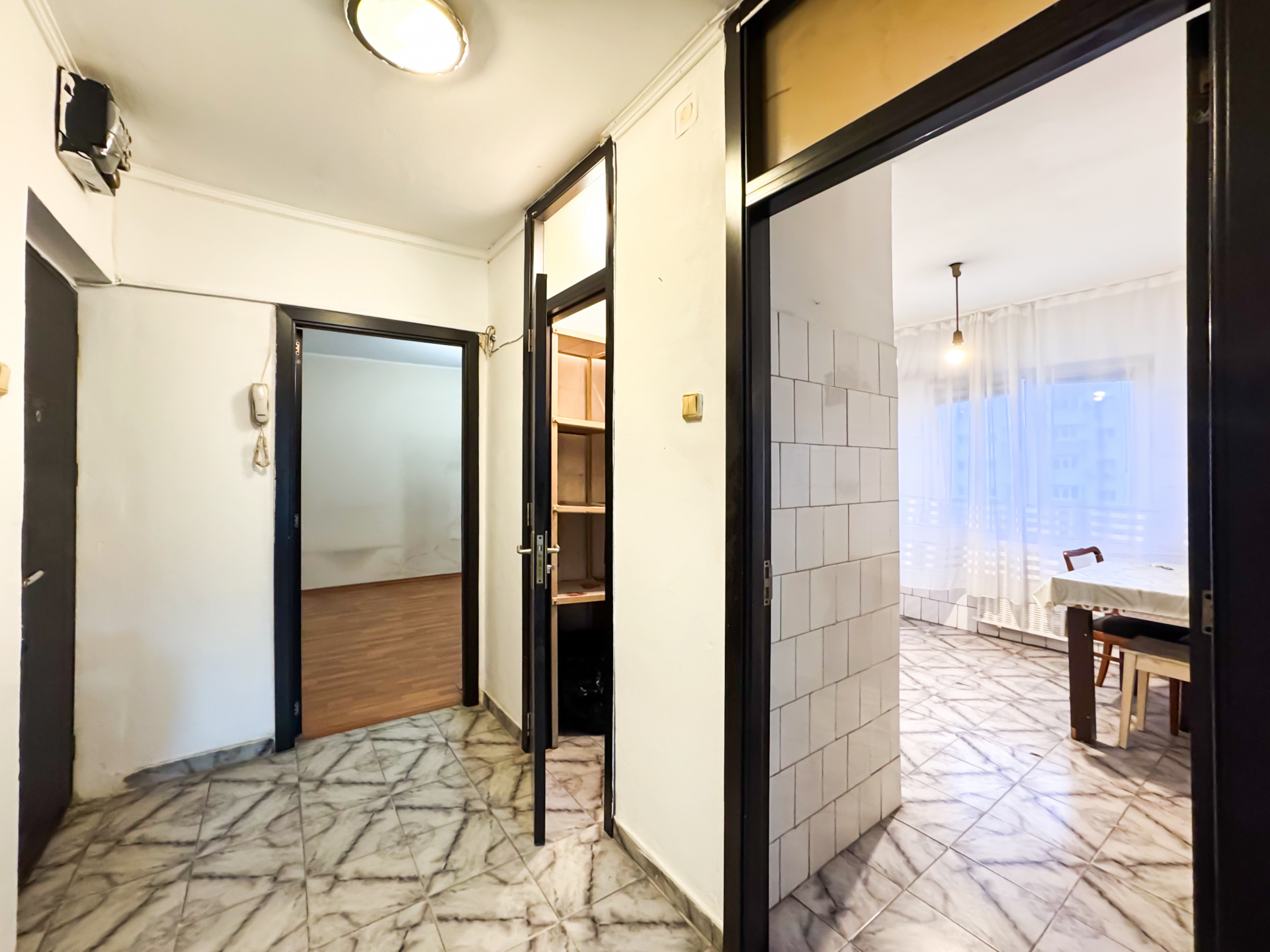 Decomandat. Impartire buna, cu sufragerie generoasa, bucatarie mare, cu debara pe pozitie, dormitoare aproximativ egale si un hol mare, lat, pe care "se intind" toate camerele. Si e un hol lat, cei care cunosc zona stiu ca sunt doua tipuri de apartamente, unul cu hol ingust si acestea, cu holul lat.